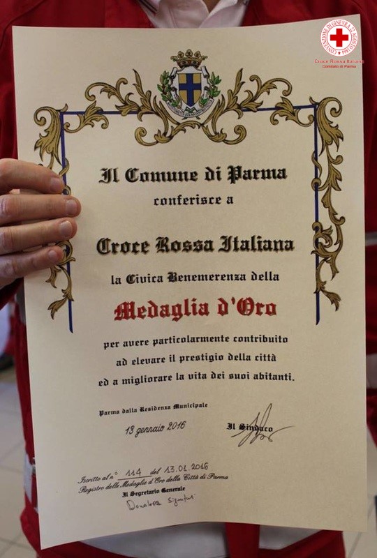La Medaglia d’Oro del Premio Sant’Ilario 2016 viene conferita alla Croce Rossa Italiana Comitato di Parma per l'opera meritevole svolta a favore della collettività in 150 anni di storia, secondo i principi di aiuto e di soccorso ispirati dal suo fondatore Jean Henry Dunant.