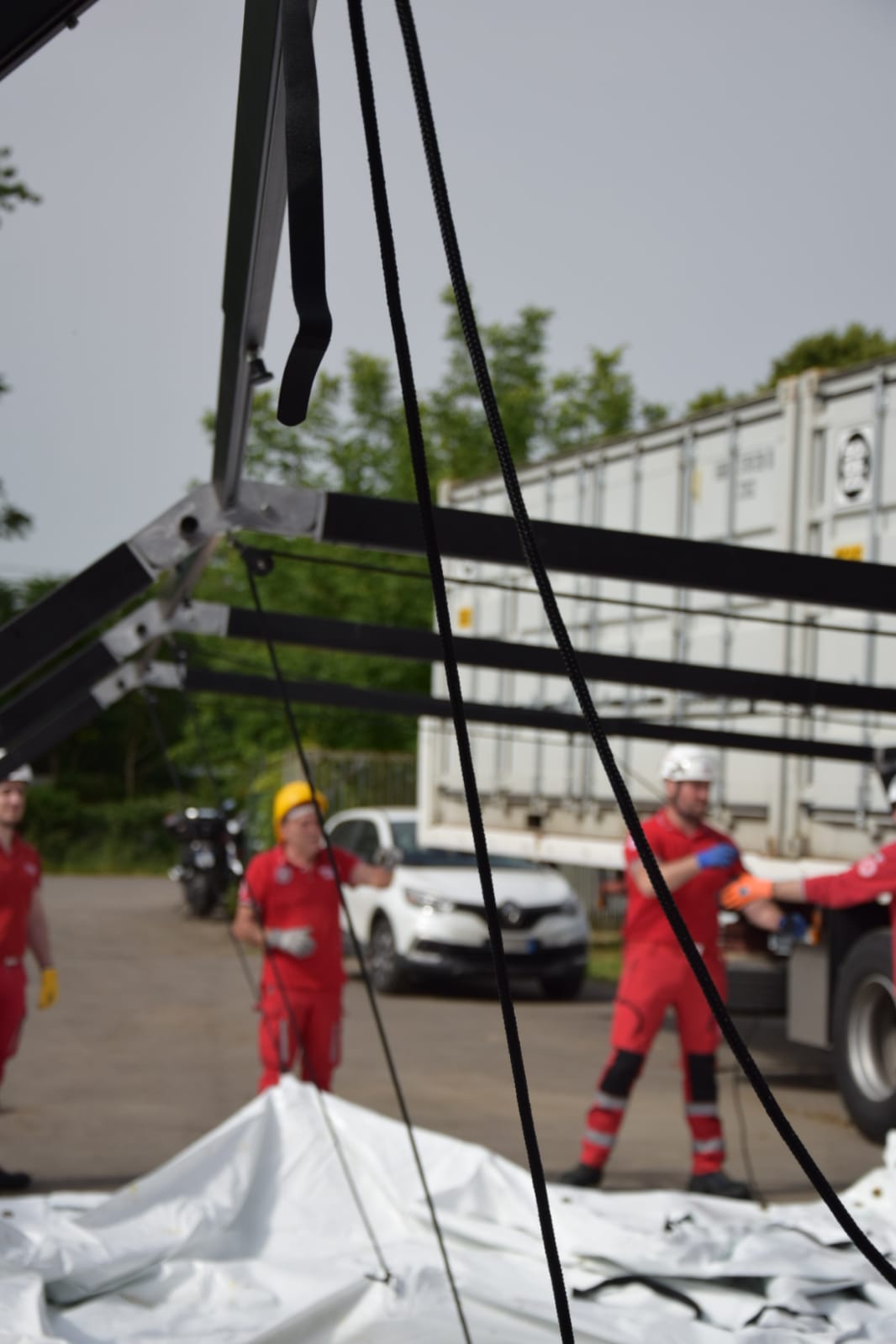 La parte pratica ha visto il montaggio di un nuovo tipo di tenda a tensostruttura che, offrendo migliori condizioni di vivibilità e comfort, oltre che sicurezza, con il tempo andrà a sostituire le tende di tipo pneumatico.