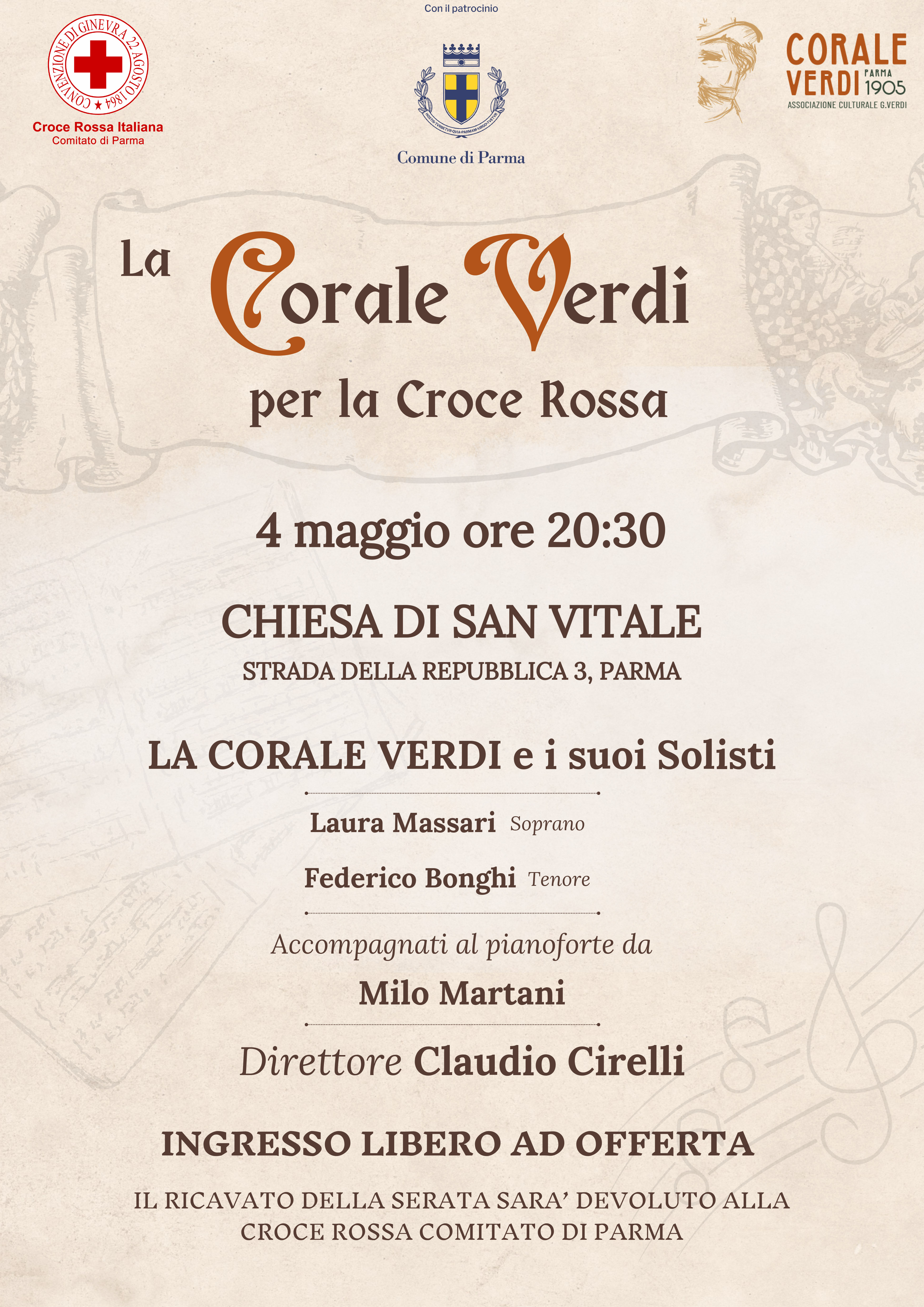 Con una conferenza stampa, sabato 26 aprile 2025, la Corale Verdi e Croce Rossa Parma annunciano ufficialmente il loro progetto. Scrivetevi la data in agenda: non si può mancare. Domenica 4 maggio 2025 alle ore 20.30 presso la Chiesa di San Vitale, sita in Strada della Repubblica 3, Parma le melodie del suono ricche di parmigianità ma anche di internazionalità inonderanno la Chiesa. Un’occasione unica in cui musica e solidarietà si incontrano grazie all’esibizione della Corale Verdi e dei suoi solisti Laura Massari (soprano) e Federico Bonghi (tenore), accompagnati al pianoforte da Milo Martani e diretti dal Maestro Claudio Cirelli.